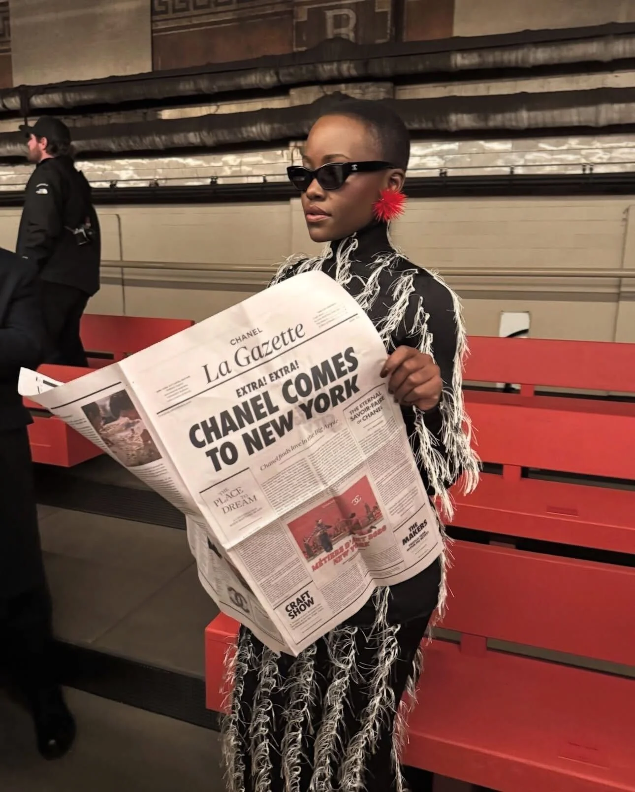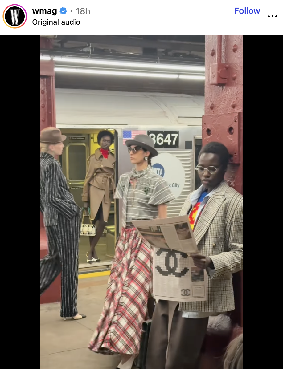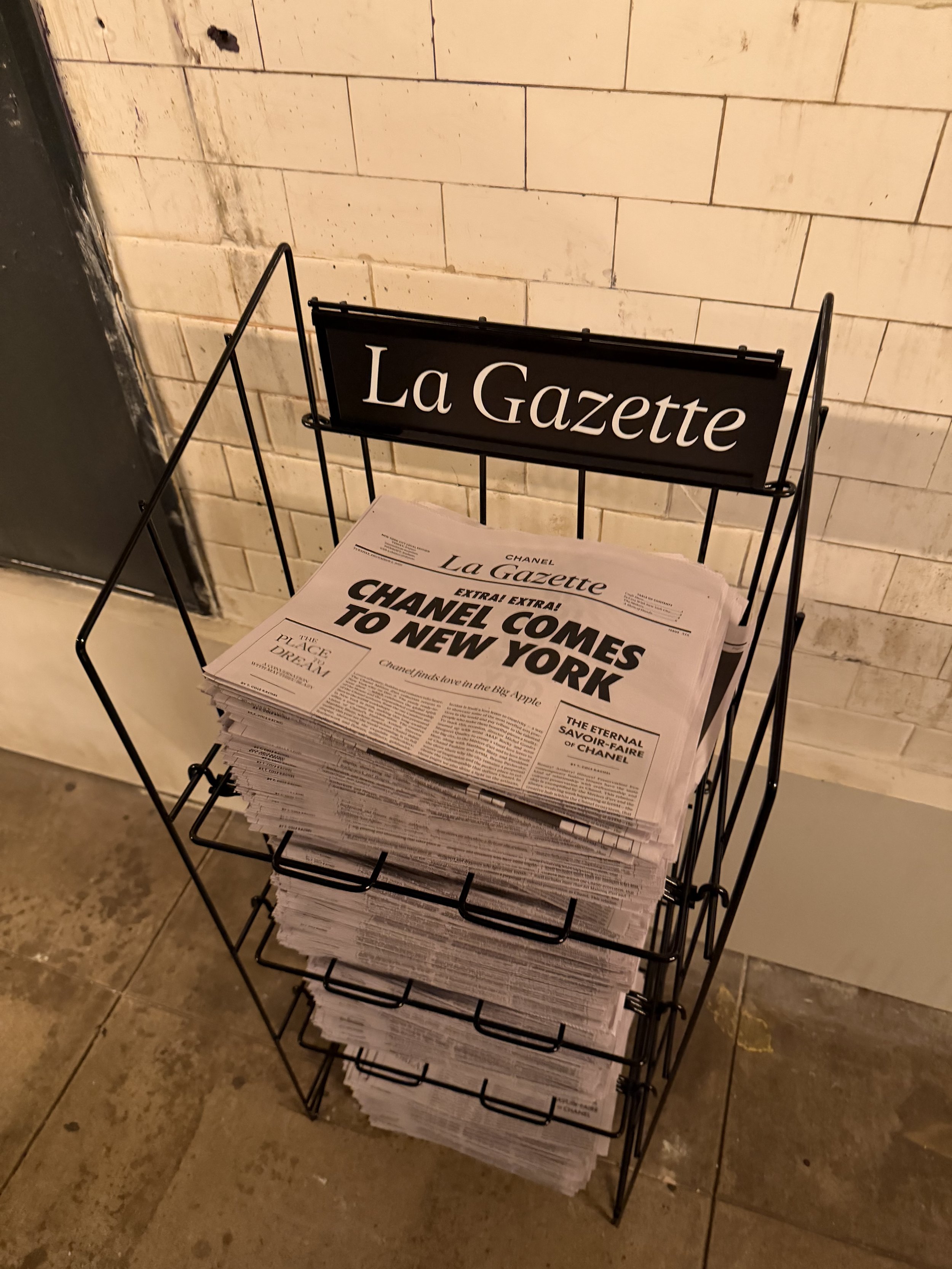 The print gazette was delivered to guests as part of their invitation to the Métiers d'art runway show — and, much to our surprise, appeared in the hands of models on the subway runway during the show itself.